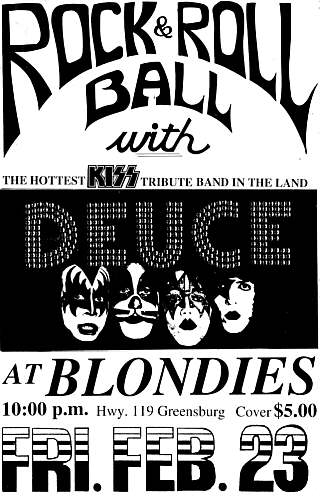 Aaron and his brother Bill were always HUGE KISS fan. When he saw an ad in the local newspaper about someone wanting to form a KISS tribute band he replied and became his idol Ace in the newly formed KISS tribute band DEUCE. The only problem was they had no one to play Paul Stanley. Aaron approached his brother with the idea of him playing Paul but Bill wasn't interested. After some time had passed and Bill learned that they still had no one to play Paul and as a result were about to give up he said he'd give it a try and DEUCE was born! I was at every Deuce show up until near the very end and that includes BOTH versions of Deuce as I built and operated the 6000 watt DEUCE sign. TWICE! Once for the first DEUCE and again for the second coming of DEUCE. I remember the first show on February 23rd, 1996 at Blondies in Greensburg. I have never seen a crowd like that before or since. The place was PACKED with people standing outside trying to watch the show through the windows! Unfortunately problems developed mostly between Aaron and Rob the bass player and the band broke up in July of 1998 after a little over two years of being together. The second version of Deuce did it's first show on May 11th, 2001 (which I believe is Bill's birthday) at Fake Fest at Star Lake Ampetheater. Bill was there playing Stanley as usual but there was a different Ace and a different Gene (bass player). Once again issue surfaced with the bass player and the second Deuce also lasted about 2 years with the last show played on June 7th, 2003. A promo video I produced for
